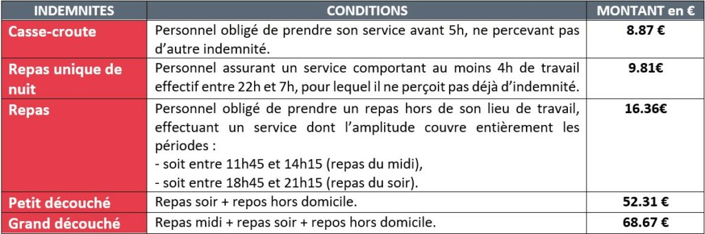 - Les indemnités de casse-croûte et le repas unique de nuit ne se cumulent pas avec le découché : voir le texte sur Legifrance.